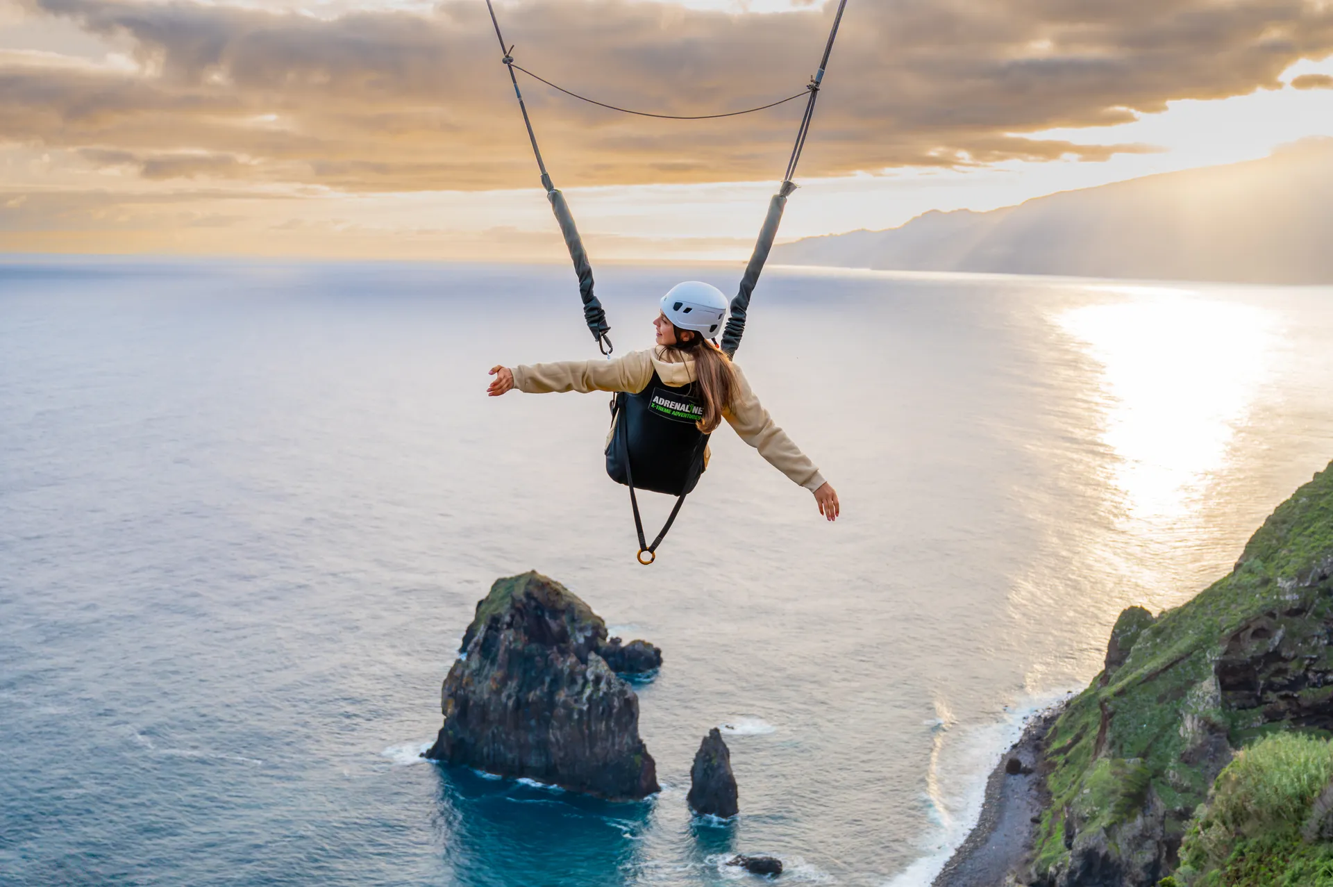 Balanças sobre o oceano com uma vista de 360°. Montanhas, falésias, o Atlântico infinito. Uma sensação que nunca vais esquecer.